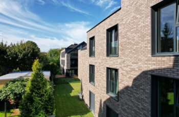 Die Gebäude der Villa Duo-Siedlung sind modernistisch, einfach in ihrer Form und in gedeckten Farben gehalten. Große Glasflächen sind Teil der architektonischen Gestaltung der Fassade.